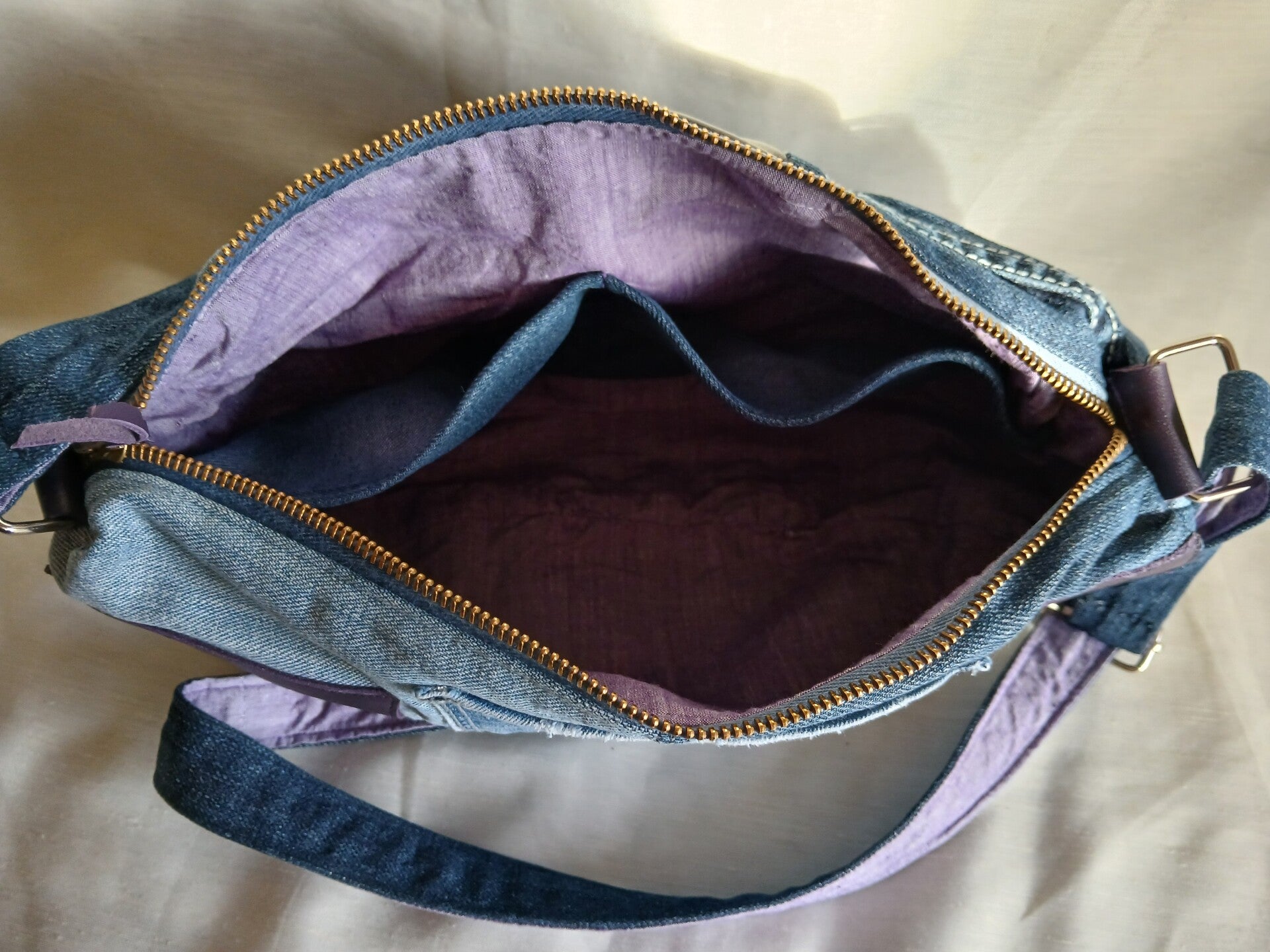 Réalisé à partir de plusieurs pantalons en jean, d'un coupon cuir pour sa décoration extérieure (merci Janine) et d'un coupon en toile mauve pour sa doublure (merci Annick). Fermeture éclair recyclée également (merci Michel).
